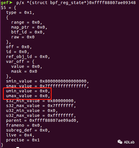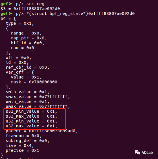 ÐÐ5365ºÍÐÐ5366£¬£¬£¬£¬£¬£¬Ö±½Ó½«dst_reg¼Ä´æÆ÷ÖеÄ64λÎÞ·ûºÅÖµ¸³Öµ¸ø32λÓзûºÅÖµ£¬£¬£¬£¬£¬£¬ÕâÏÔ×ÅÊǹýʧµÄ¡£¡£¡£¡£ÀýÈçÉèÖÃdst_reg->umin_value=1£¬£¬£¬£¬£¬£¬dst_reg->umax_value=0x600000001£¬£¬£¬£¬£¬£¬µ±¾ÙÐÐÈçÉϲÙ×÷ºó£¬£¬£¬£¬£¬£¬dst_reg->s32_min_valueΪ1£¬£¬£¬£¬£¬£¬¿ÉÊÇdst_reg->s32_max_valueÒ²½«ÊÇ1£¬£¬£¬£¬£¬£¬ÓÉÓÚ0x600000001µÄ¸ß뽫±»½Ø¶Ï£¬£¬£¬£¬£¬£¬Õâʱdst_reg¼Ä´æÆ÷µÄ¹æÄ£´Ó[1,0x600000001]Äð³ÉÁË[1,1]£¬£¬£¬£¬£¬£¬Õâ»á±»ÑéÖ¤Æ÷ʶ±ðΪ³£Êý1£¬£¬£¬£¬£¬£¬½ø¶øÈƹýÑéÖ¤Æ÷¼ì²é¡£¡£¡£¡£Îó²î²¹¶¡ÖУ¬£¬£¬£¬£¬£¬¾ÙÐÐÁË׼ȷµÄ32λÓзûºÅÖµ¸³Öµ²Ù×÷£¬£¬£¬£¬£¬£¬ÈçÏÂËùʾ£º