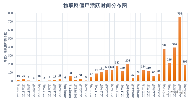 ÎÒÃǶÔÕâЩÑù±¾µÄ»îÔ¾ÊýÄ¿ºÍ»îԾʱ¼ä¾ÙÐйØÁªÍ³¼Æ£¬£¬£¬»æÖÆÁËÎïÁªÍø½©Ê¬»îԾʱ¼äÂþÑÜͼ£¬£¬£¬¼ûͼ6¡£¡£¡£ ¡£¡£´ÓÕâÅúÑù±¾µÄ¹¥»÷ʱ¼äÀ´¿´£¬£¬£¬ÖÁÉÙ´Ó2018Äê1ÔÂ×îÏÈ£¬£¬£¬¹¥»÷Õß¾Í×îÏÈʹÓÃGafgyt¡¢Mirai×齨ÎïÁªÍø½©Ê¬ÍøÂ磬£¬£¬È»ºóʹÓÃ×齨ºÃµÄ½©Ê¬ÍøÂç¾ÙÐÐDDoS¹¥»÷IJÀû¡£¡£¡£ ¡£¡£2019Äê3Ô¹¥»÷×îÏÈ»îÔ¾£¬£¬£¬2019Äê10Ô·ºÆðÁËÒ»¸öСá¯Á룬£¬£¬¹¥»÷µÄ×îá¯ÁëÔò·ºÆðÔÚ2020Äê8Ô¡£¡£¡£ ¡£¡£